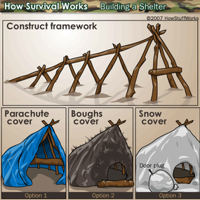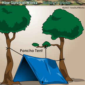 Then tie up a line to the center of the opposite side of the tarp. Choose a location far enough away from water forms so that if it floods, your shelter turn into a raft…. Using one of the two shorter logs, place it into the notches at the front of the shelter.